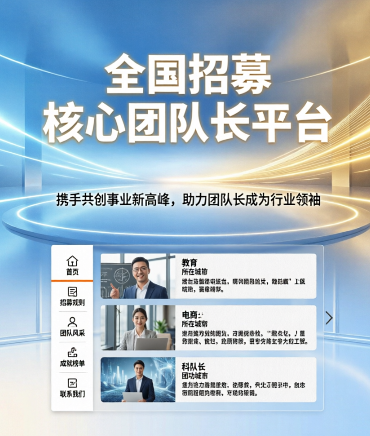 今天,我们为你提供了一个绝佳的机会:通过我们的平台,全国招募核心团队长。我们将提供从产品支持到全程培训的全面支持,帮助你带领自己的团队走向成功。无论你是有经验的管理者,还是刚刚踏入团队管理的新人,只要你拥有领导力与决策力,我们都欢迎你加入,成为我们的核心团队长,共同开创事业新高峰。
