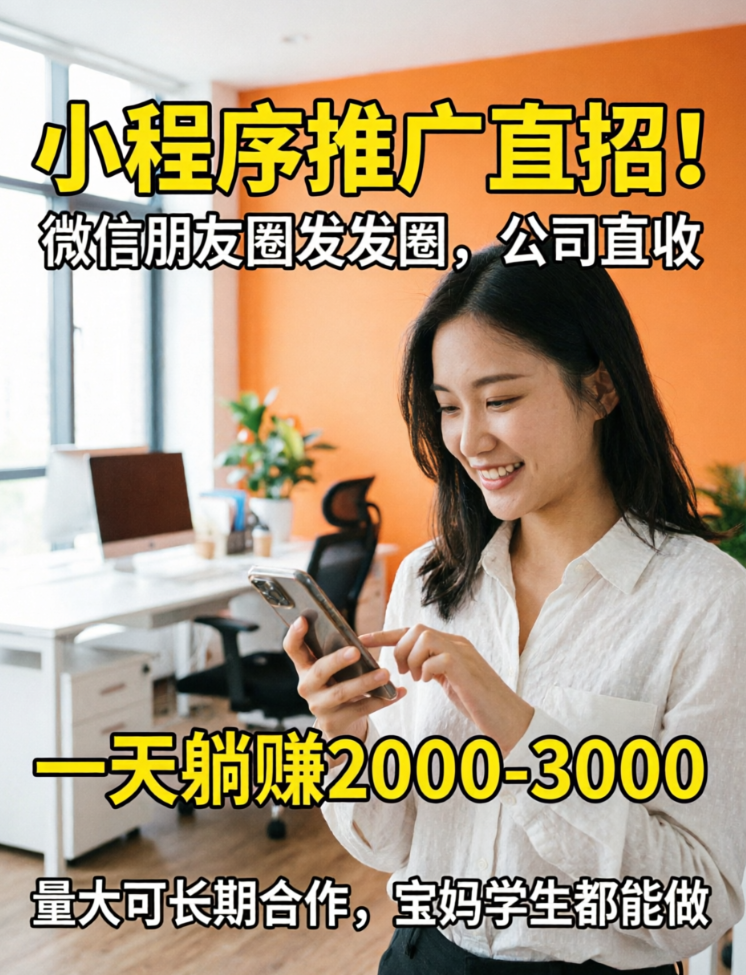 别急,今天咱们就聊聊这个被无数人验证过的“零门槛”副业——小程序推广直招!不用囤货、不用露脸、不用专业技能,只需要在微信朋友圈发发圈,公司直收,一天就能躺赚2000-3000,量大还能长期合作,宝妈、学生、上班族都能轻松上手,关键是真的简单!