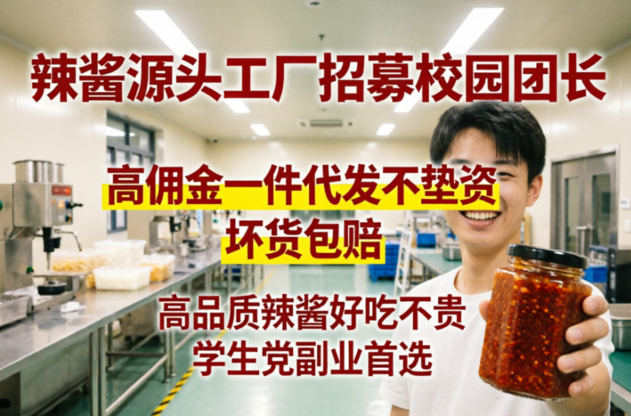 辣酱源头工厂招募校园团长,本质上是“人脉换利润”——你用班级群、社团群、宿舍楼的人脉帮工厂卖货,工厂用高佣、一件代发、坏货包赔给你回报。这种“双赢”的合作,才是普通人能抓住的真实风口。